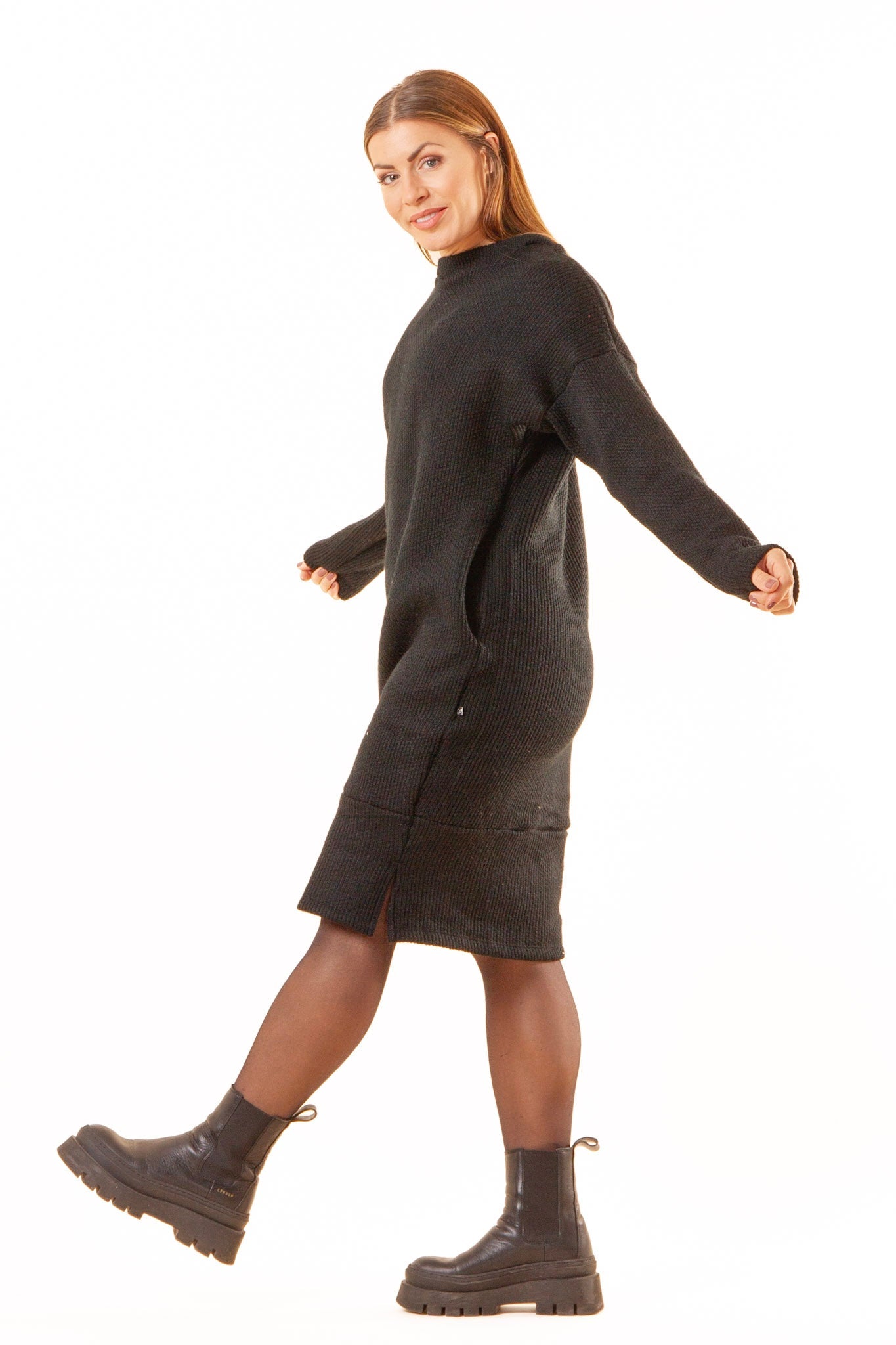 Kaelina Sort Strikket Sweaterkjole – Hyggelig og Rummelig Lang Sweater med Rygdetaljer til Kvinder