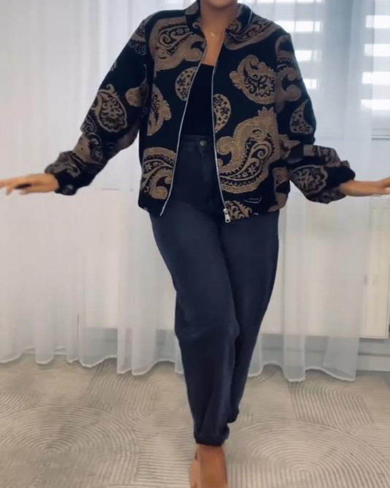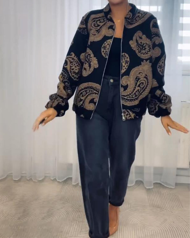 Dame vintage paisleyjakke med lynlås, standkrave og lange ærmer til elegant hverdagsstil