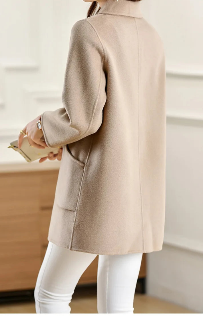 Solaire uldjakken er lavet af dobbeltstrikket uld, der giver uovertruffen blødhed både indvendigt og udvendigt. Den tidløse struktur er kombineret med praktiske detaljer som perlebesatte knapper og dybe lommer. Denne jakke er perfekt til gåture i byen, kaffeture eller kolde dage, hvor du ønsker både stil og komfort.