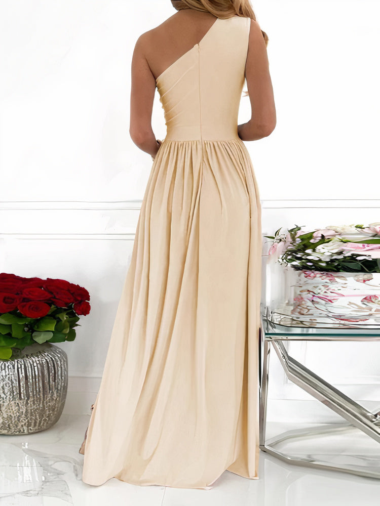 Design: Maxiklänning med asymmetrisk halsringning och hög slits