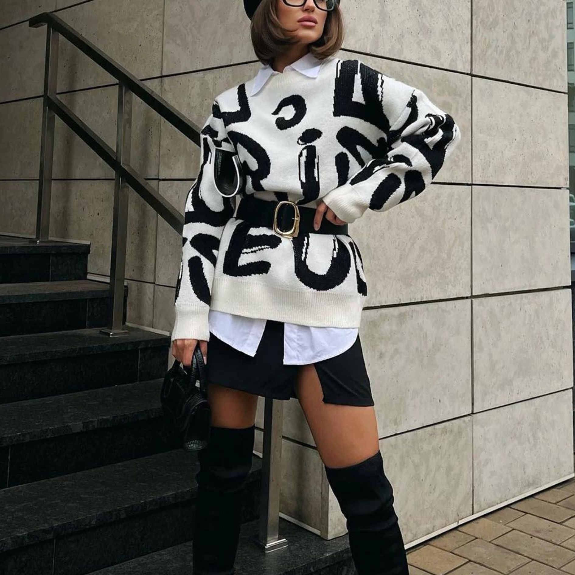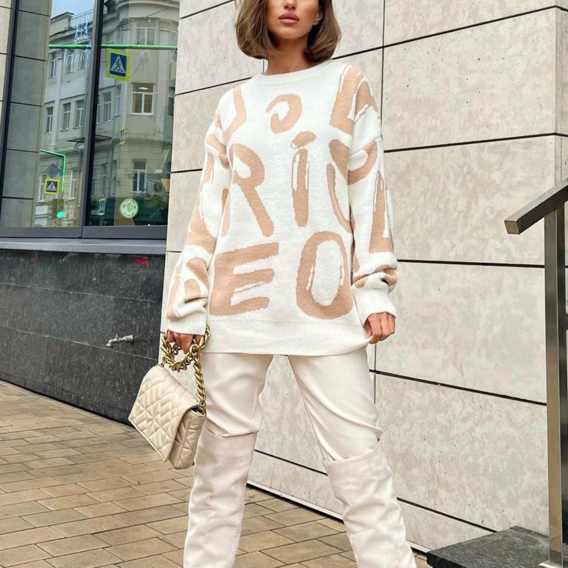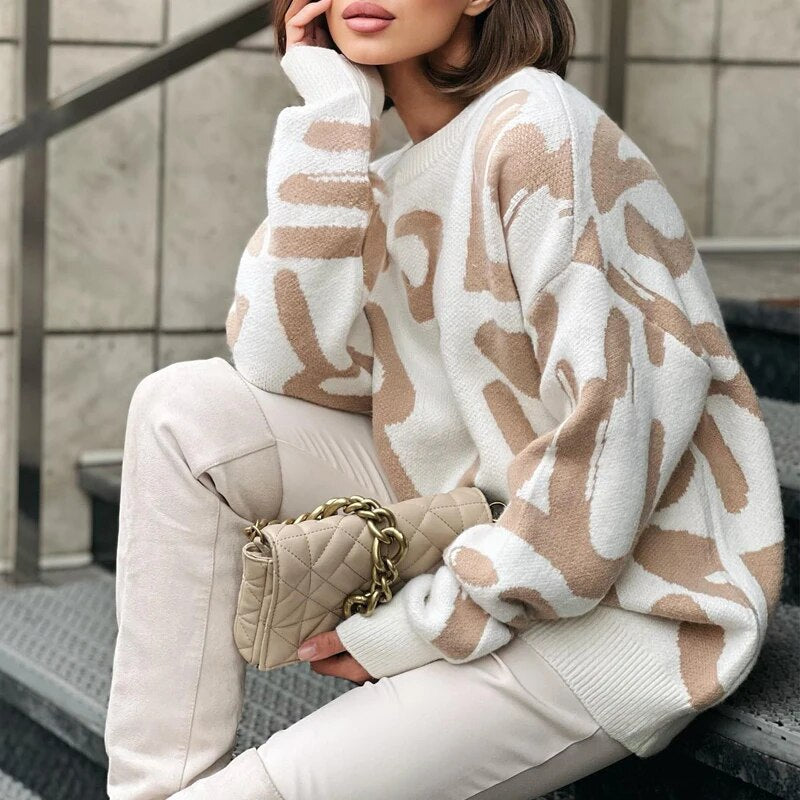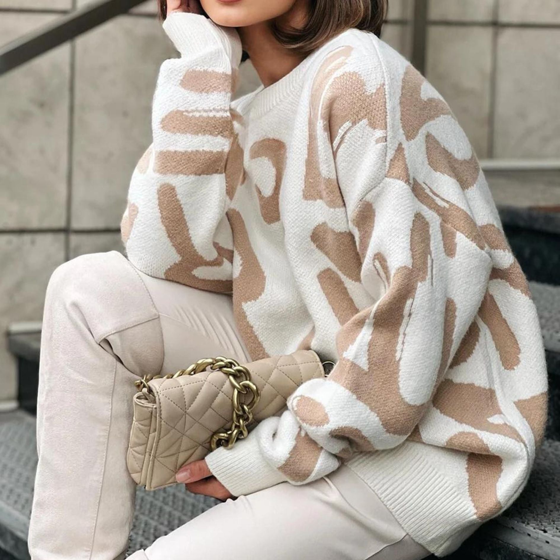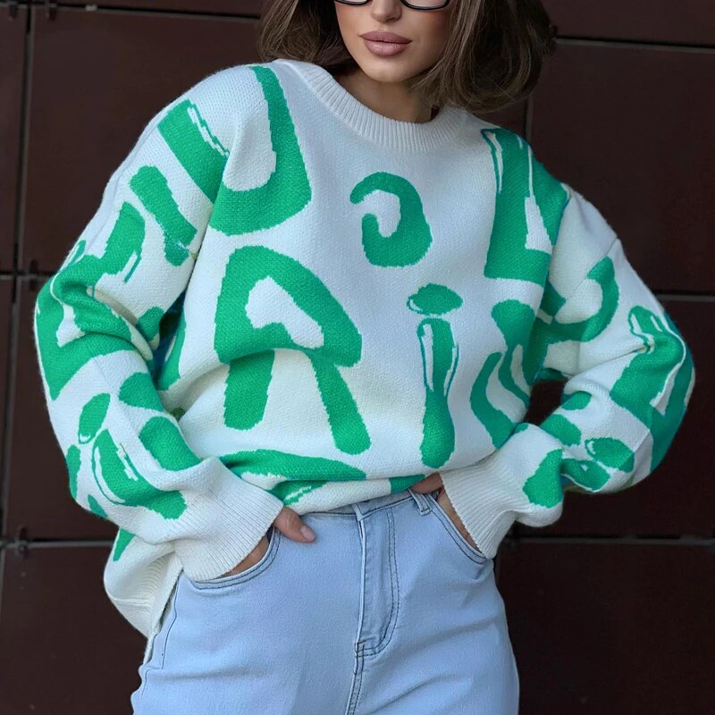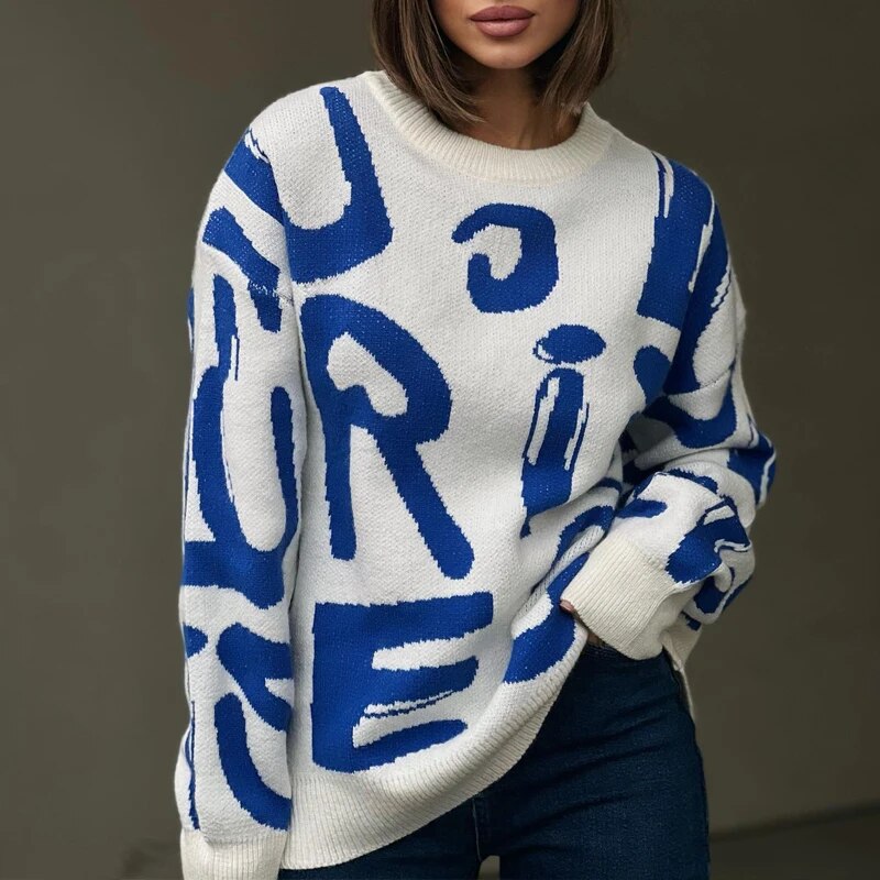 Wilhelmina – Stickad Damtröja med Grafiskt Tryck och Rund Hals för Chic och Casual Look